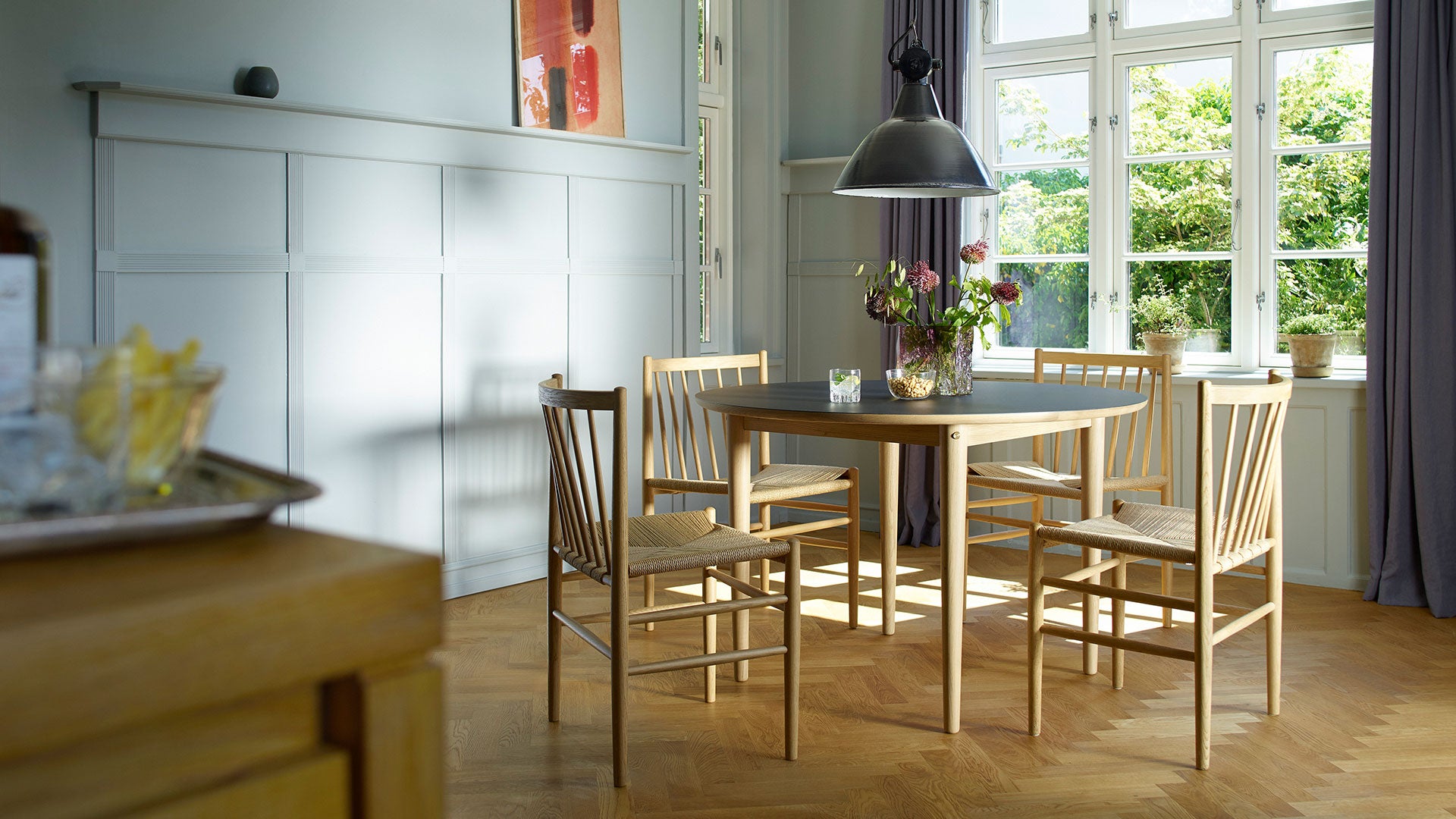 Der Stabstuhl J46 von 1956 ist einer der größten Erfolge von FDB Møbler. Es wird geschätzt, dass der zeitlose Klassiker von Poul Volther zu den meistverkauften Stühlen in Dänemark gehört