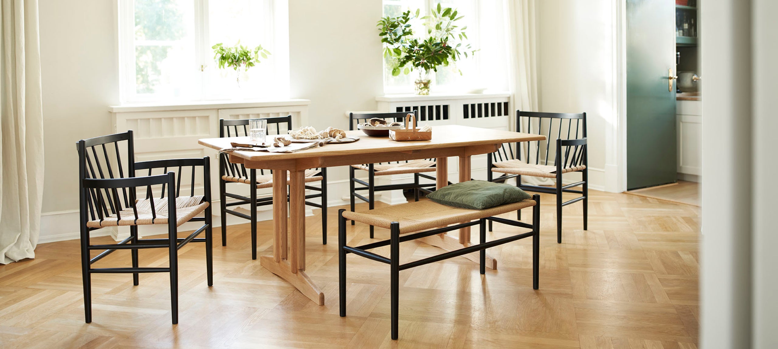 Diese Flechtserie des bekannten FDB-Designers Jørgen Bækmark umfasst mehrere Möbelstücke, darunter den klassischen und ikonischen Esstischstuhl J80. Der Stuhl stammt aus dem goldenen Zeitalter von FDB Møbler in den 1950er Jahren und hat dank seines eleganten und zeitlosen Aussehens bis heute überlebt. Der J80 ist auch mit Armlehnen und als freistehender Stuhl erhältlich. Dank der hochwertigen Materialien – vom Geflecht bis zum Massivholz - ist der J80 auch über längere Zeit hinweg bequem zu sitzen.